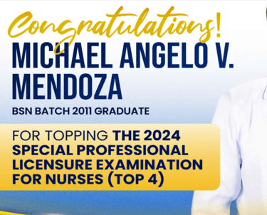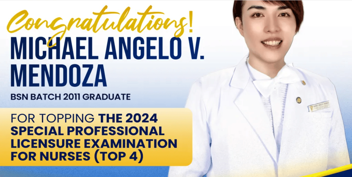 Michael Angelo V. Mendoza, a graduate of Bachelor of Science in Nursing in 2011, topped the Philippine Nurses Special Professional Licensure Examination 2024 conducted in the Middle East and Singapore last June 16-17.