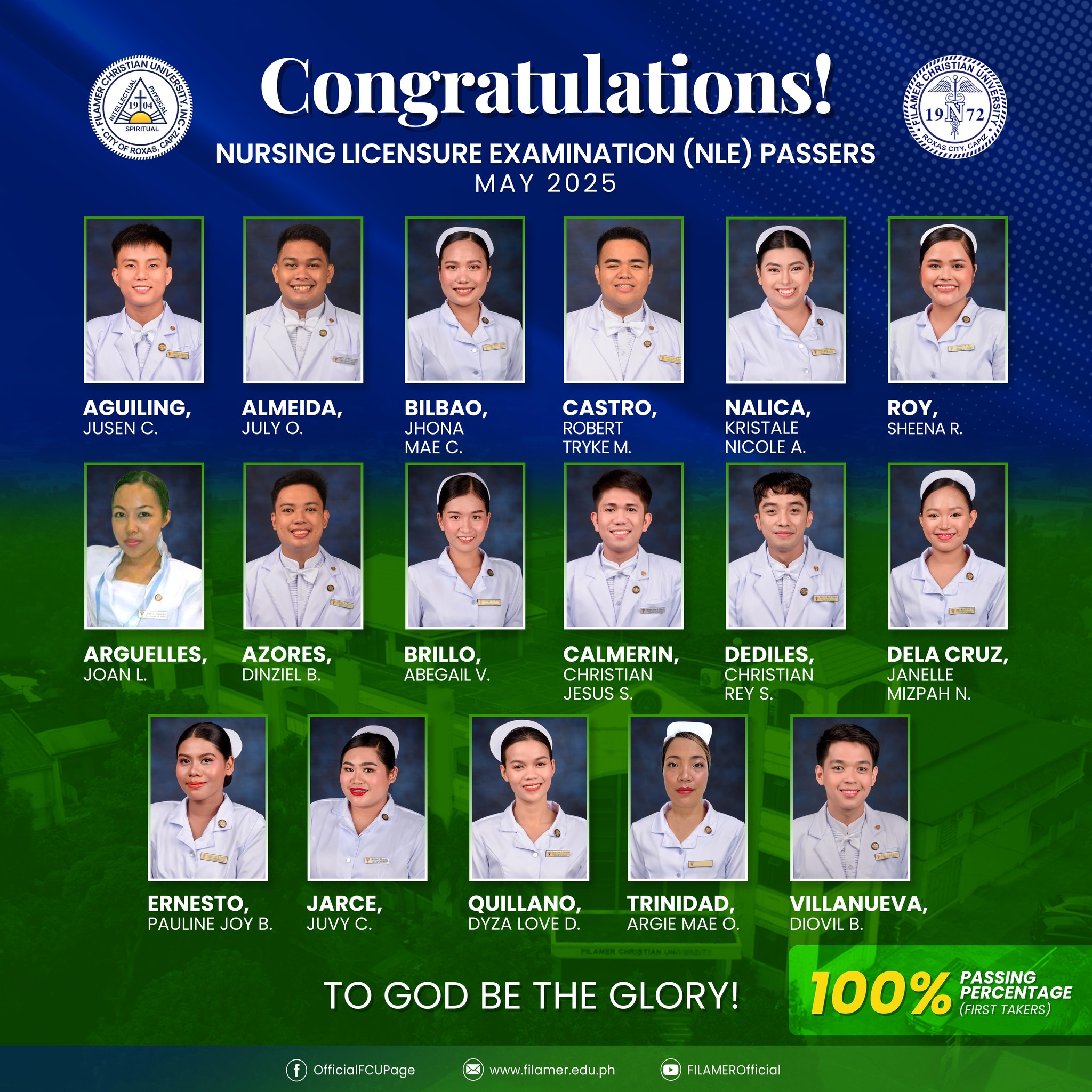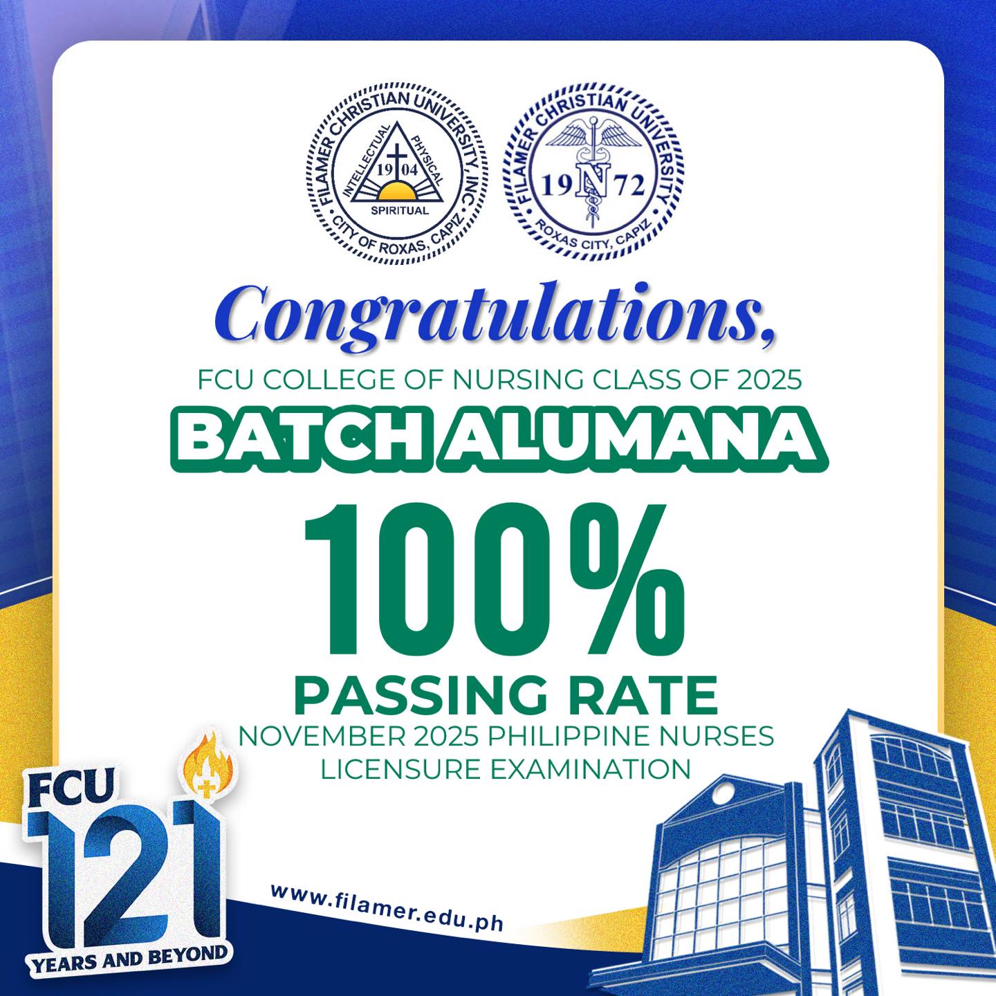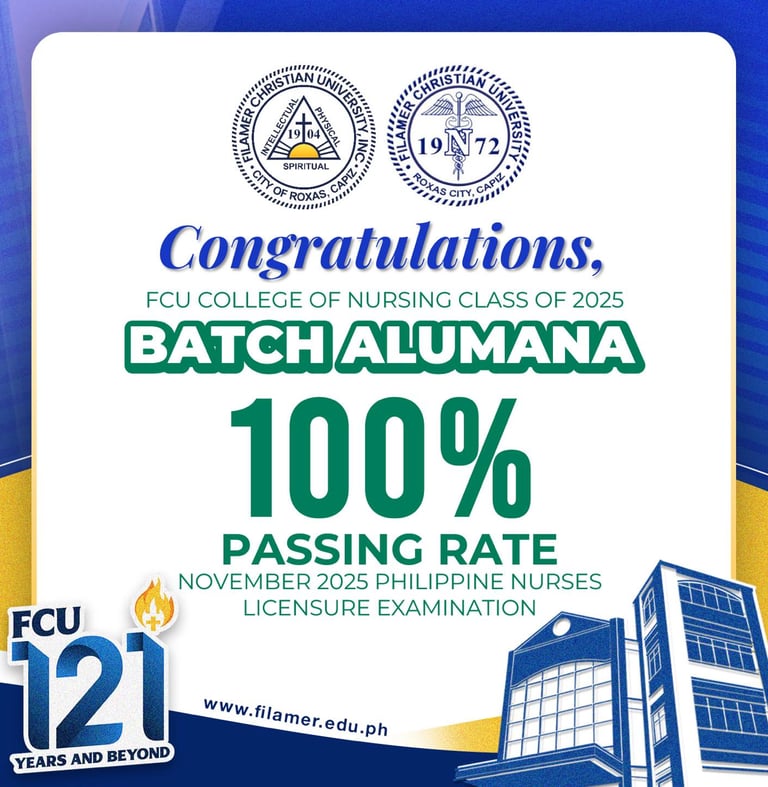 Filamer Christian University - College of Nursing (FCUCN) has once again reaffirmed its enduring commitment to excellence in nursing, achieving 100% passing rate in the recent February 2026 Philippine Nursing Licensure Examination (PNLE), March 6.